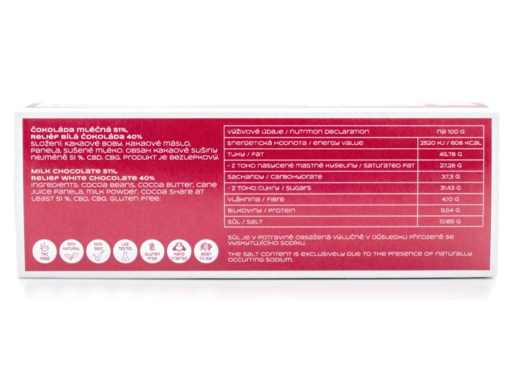 Složení: Kakaové boby, kakaové máslo, panela, sušené mléko. Obsah kakaové sušiny nejméně 51 %, CBD. Produkt je bezlepkový, veganský, bez konzervantů, barviv a aromatů.