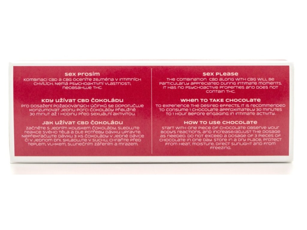 Dávkování: 20 mg CBD a 15 mg CBG v jedné čokoládě. Nepřekračujte dávku 3 ks čokolády v jedné dávce či v jednom dni.