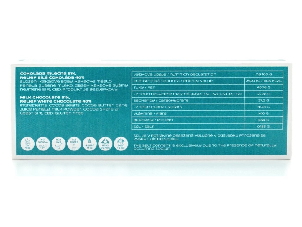 Složení: Kakaové boby, kakaové máslo, panela, sušené mléko. Obsah kakaové sušiny nejméně 51 %, CBD. Produkt je bezlepkový, veganský, bez konzervantů, barviv a aromatů.