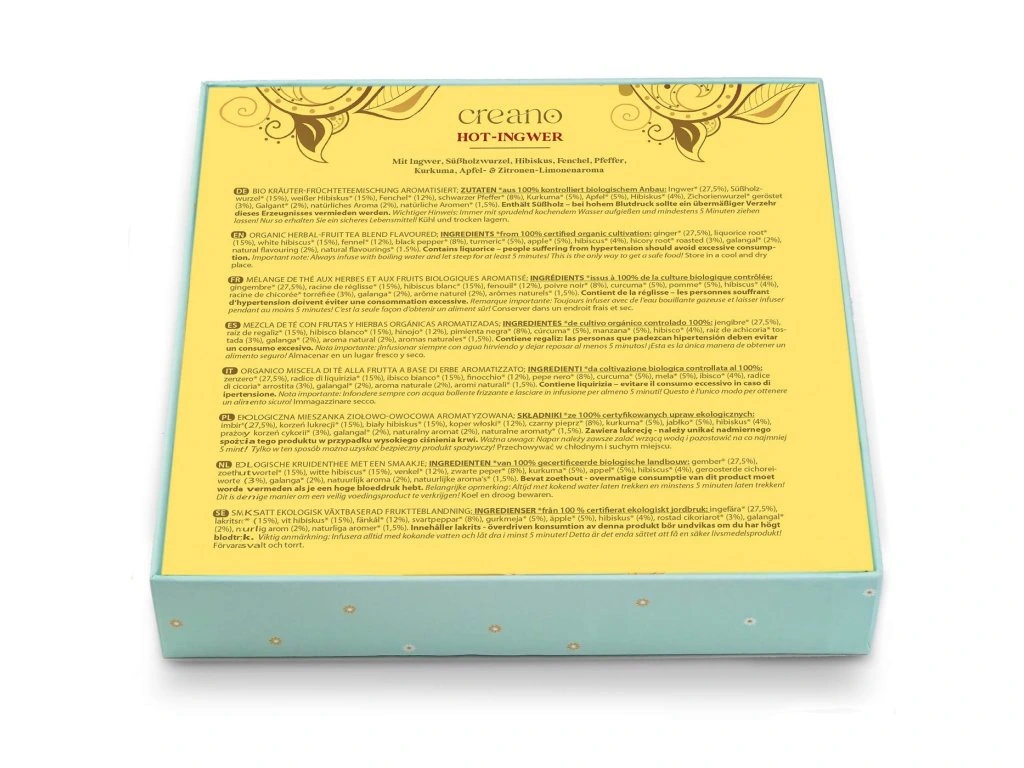 Všechny čajové směsi jsou 100% z certifikovaného bio zemědělství, přirozeně bez kofeinu, vyrobené v Německu.