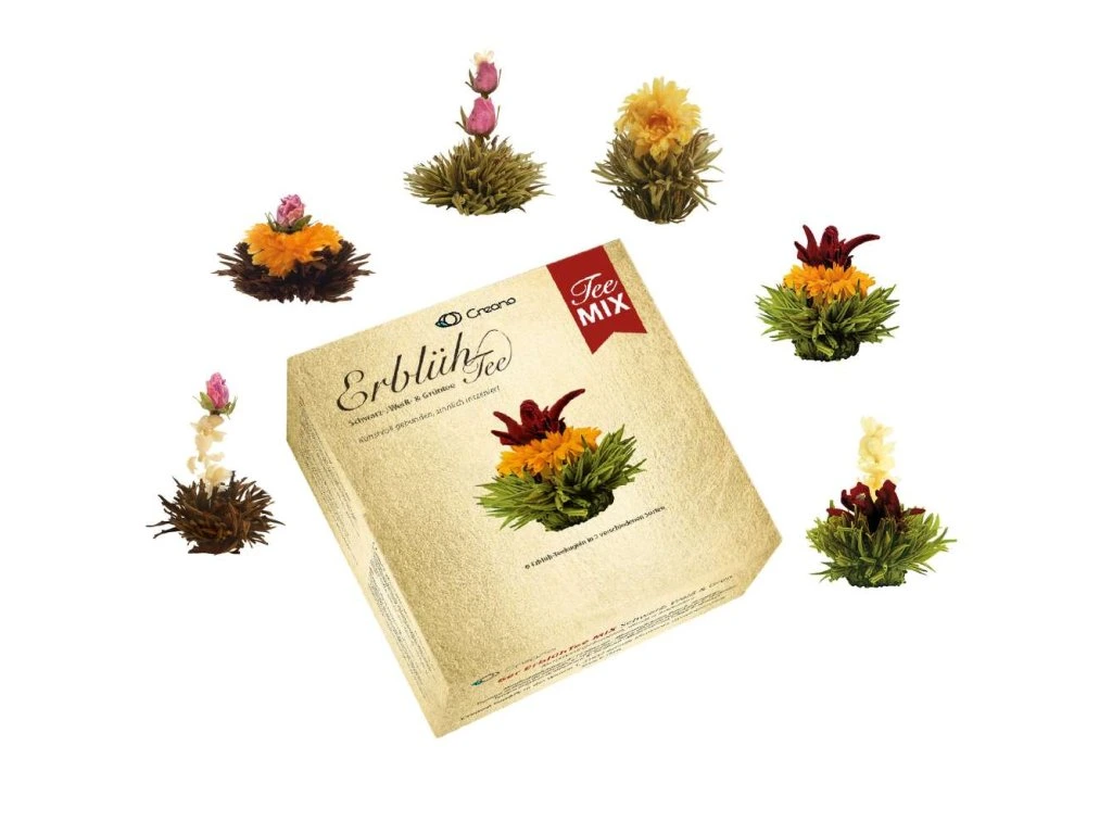 Zažijte kouzlo čínského čajového umění s kolekcí Creano ErblühTee MIX. Sada obsahuje 6 ručně vázaných kvetoucích čajových koulí ze tří různých druhů čaje – bílého, zeleného a černého. Každá koule skrývá uvnitř umělecky vpletenou exotickou květinu, která se odhalí teprve po zalití vroucí vodou.