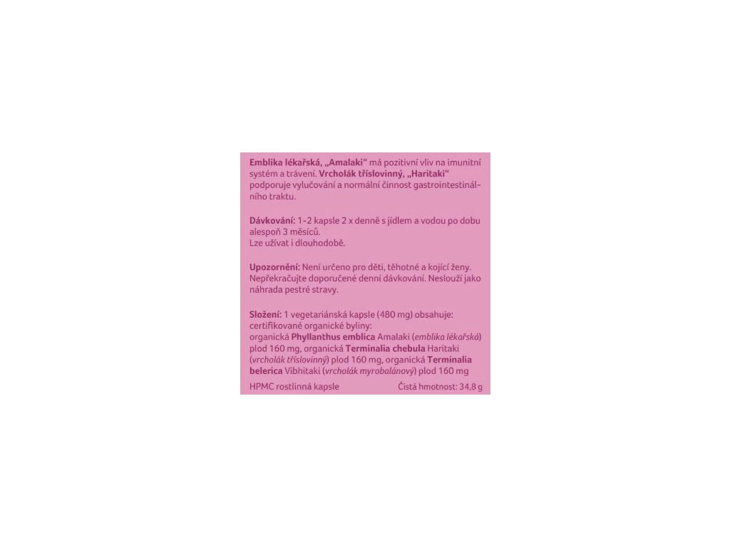 Podpora detoxikace a vylučování. Triphala je celosvětově známá a tisíce let stará ájurvédská kombinace tří ovocných plodů Amalaki, Haritaki a Bibhitaki, které napomáhají vylučování, činnosti jater a normální činnosti gastrointestinálního traktu.